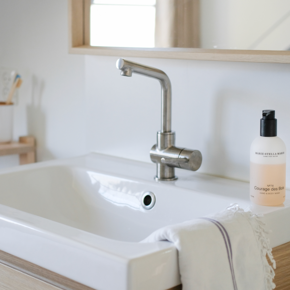 Eine schöne Außendusche zum Beispiel, um die eigenen Kinder vom Meer abzuspülen, ein Bücherregal mit kultureller und kulinarischer Inspiration und mehr als genug intelligenter Stauraum. Auch auf der sehr geräumigen Terrasse fehlt es an nichts. Mehrere Sitzgelegenheiten und ein langer Esstisch sorgen für gemütliche, lange Sommerabende zu zweit.