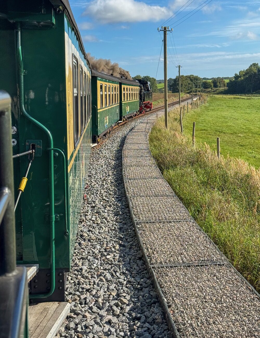 Fair ist fair: Der Name ‚Rasender Roland‘ lädt nicht gerade zu einer gemütlichen Fahrt ein. Zum Glück hat Roland nichts ‚Rasendes‘ an sich, er ist nur der Spitzname für die alte Dampflok der Rügenschen BäderBahn, die noch immer täglich zwischen Lauterbach und Göhren verkehrt. Eine Strecke von nur 24 Kilometern, aber Roland lässt sich Zeit.