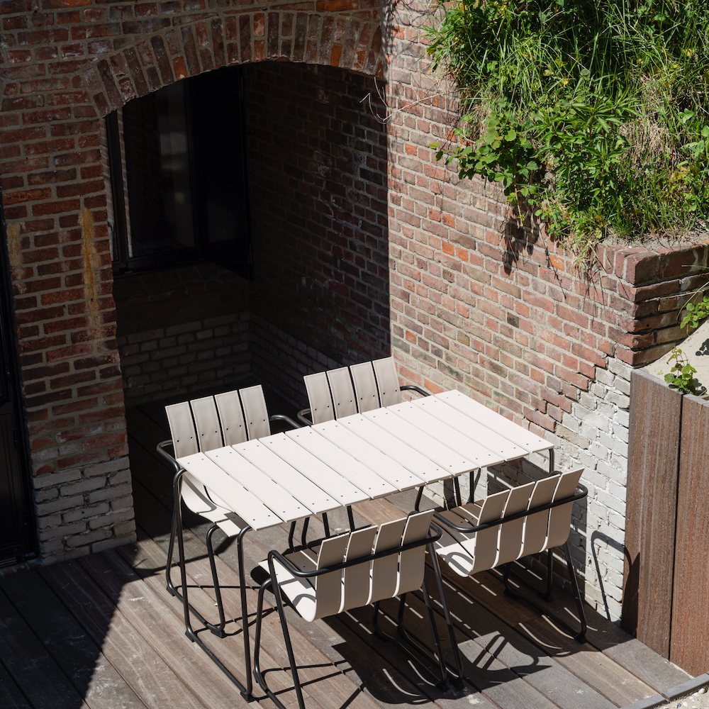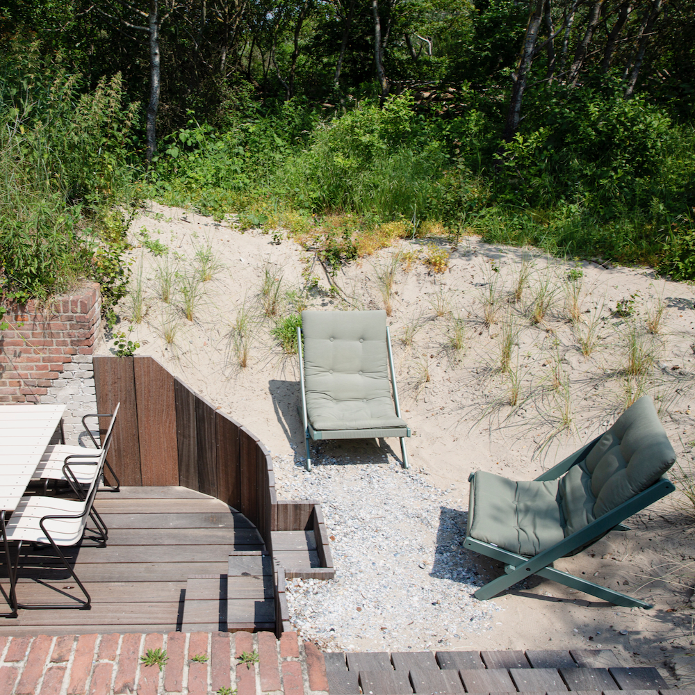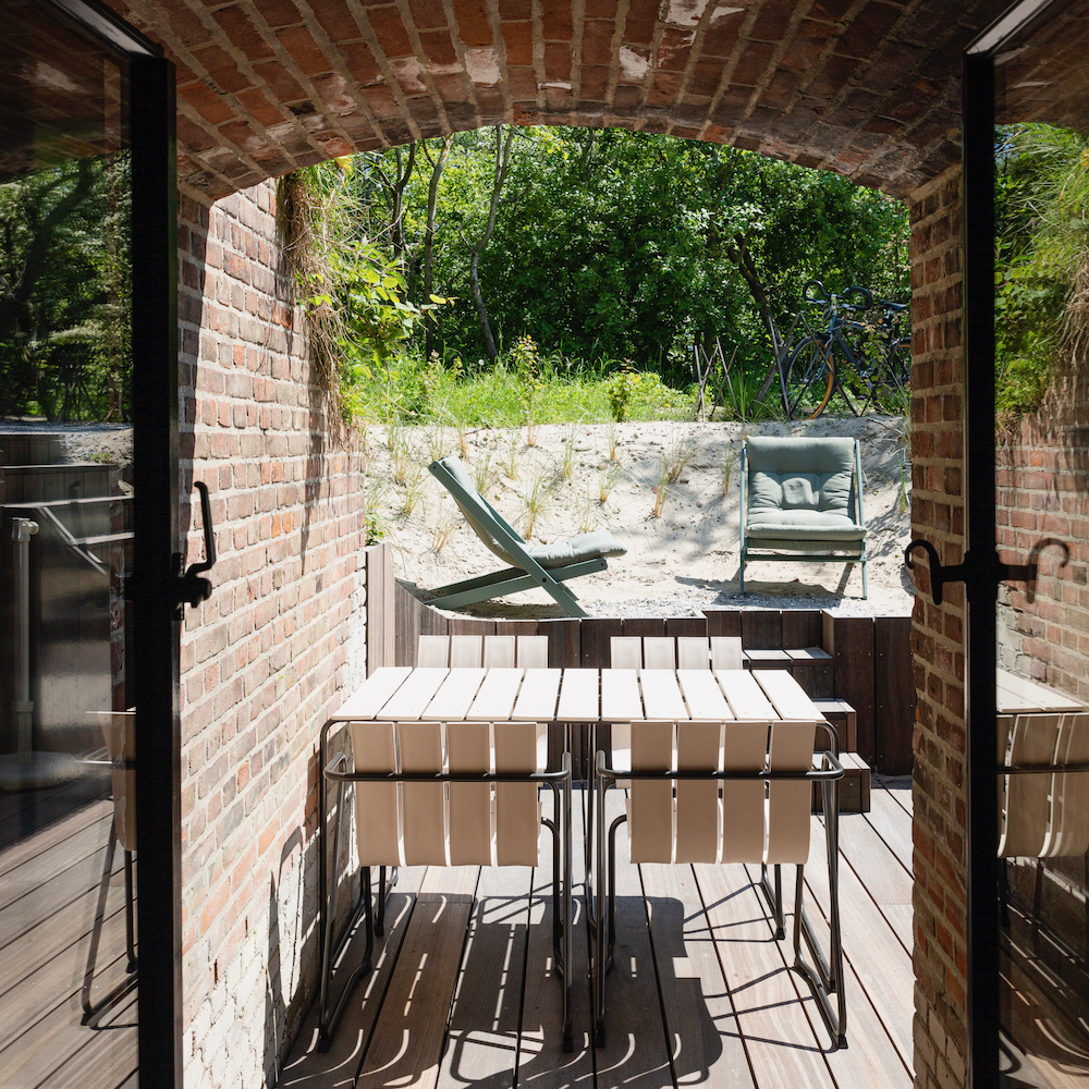 Auch die umgebende Landschaft wurde bei der Renovierung berücksichtigt. Vor dem Bunker gibt es jetzt eine Terrasse mit einem Essbereich und es gibt schöne Stühle im Sand.