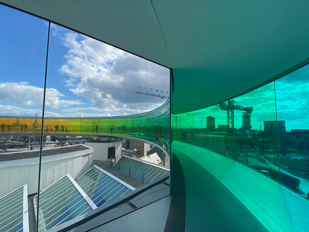- Wolltest du schon immer mal wissen, wie es sich anfühlt, durch einen Regenbogen zu laufen? Dann solltest du dir das Museum für moderne Kunst ARoS nicht entgehen lassen. Auf dem Dach hat der Künstler Olafur Eliasson einen 150 Meter langen, runden, transparenten Tunnel in allen Farben des Regenbogens entworfen: Your Rainbow Panorama. Durch eine rote, violette und gelbe Brille hast einen wunderschönen Blick auf die Altstadt von Aarhus, den Hafen und in der Ferne das neue Viertel Ø. Es ist ein besonderes Erlebnis, wie kühl sich die Farbe Blau anfühlt. Und wie sich deine Sicht auf die Welt verändert, sobald du die orangefarbene Innenwand betrittst. Auch wenn die Sonne nicht scheint, sieht Aarhus dann sehr sommerlich aus. Im ARoS-Museum wanderst du vom „Himmel in die Hölle”. Vom Regenbogen auf dem Dach zu den dunklen Ausstellungsräumen im Keller. – Aros Allé 2, 8000 Aarhus