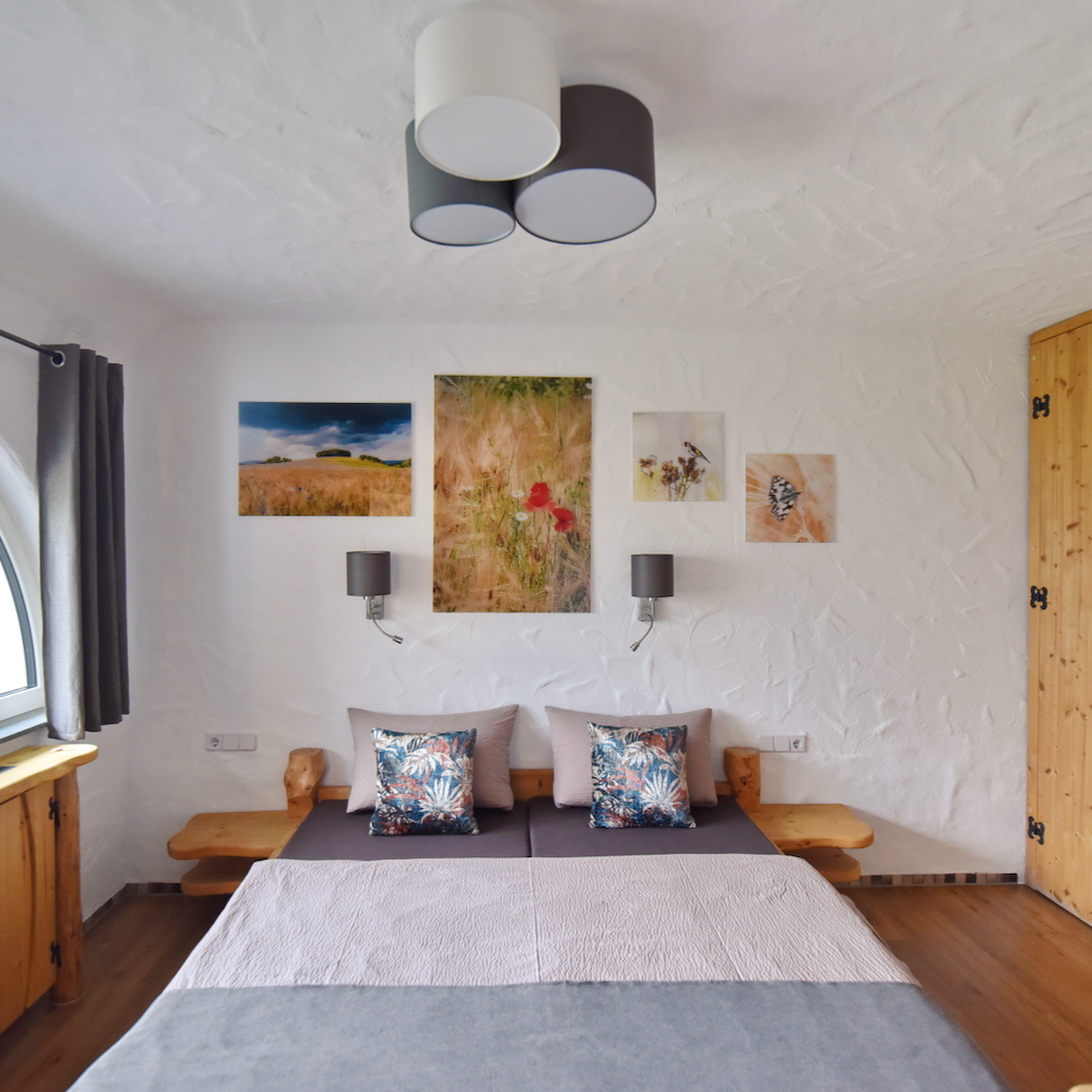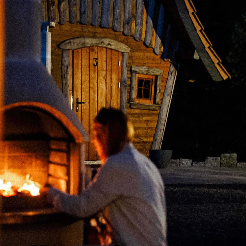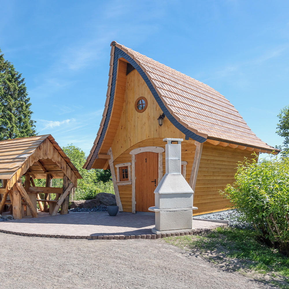 Mein Herz schlägt schneller bei den Hexenhäusern. Sie sind kleiner, verwinkelter und vielleicht sogar ein bisschen frecher im Erscheinungsbild. Diese fantasievoll gestalteten Holzhäuschen regen vor allem die Vorstellungskraft deiner Kinder an. Innen sind sie kompakt eingerichtet, verteilen sich über zwei Etagen und bieten Platz für zwei bis vier Personen. Unten steht ein Doppelbett, oben wartet eine gemütliche Schlafnische. Ein Kühlschrank und ein Wasserkocher gehören ebenfalls zur Ausstattung. Das Badezimmer befindet sich etwas außerhalb der Hütte. Der Aufenthalt hier ist schlichter als in den Erdhäusern – und genau das macht seinen besonderen Charme aus. Romantisch zu zweit und herrlich verspielt mit Kindern. Draußen lädt eine kleine Terrasse mit Grill zum Verweilen ein – perfekt für entspannte Stunden, einen Grillabend oder gar ein Lagerfeuer.