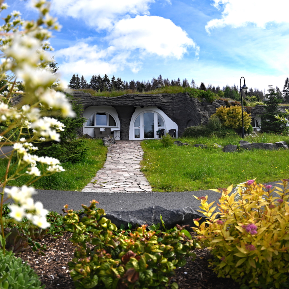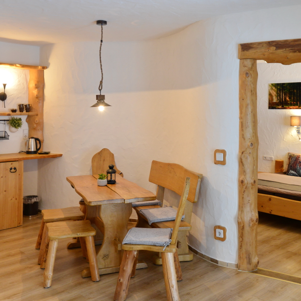 Möchtest du in einem Erdhaus für 2–4 Personen wohnen oder lieber in einem Hexenhaus für 2–4 Personen? Die Erdhäuser sind die absoluten Hingucker des Geländes. Die runden, halb in die Erde gebauten Häuschen wirken von außen charmant verwunschen und überraschen innen mit erstaunlich viel Platz. Auf rund 45 m² finden zwei bis vier Personen bequem Platz. Die Einrichtung aus viel Holz, runden Formen und natürlichen Materialien schafft sofort eine gemütliche Atmosphäre. Es gibt ein separates Schlafzimmer mit Doppelbett und Etagenbett, ein Wohnzimmer mit Sitzecke und einem Holzofen für gemütliche Abende. Außerdem erwarten dich ein modernes Bad, ein Kühlschrank, ein Wasserkocher, ein Fernseher und eine eigene Terrasse im Freien. Selbst kochen kannst du hier zwar nicht, aber genau das macht den Aufenthalt besonders entspannt.