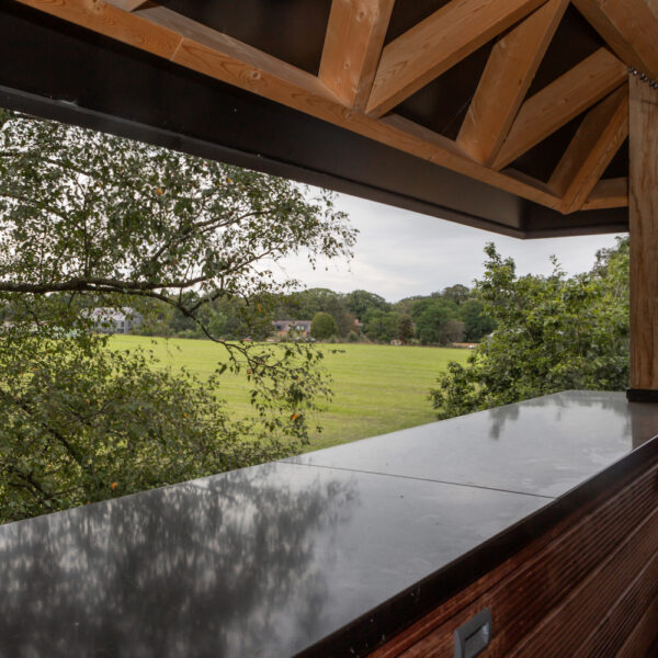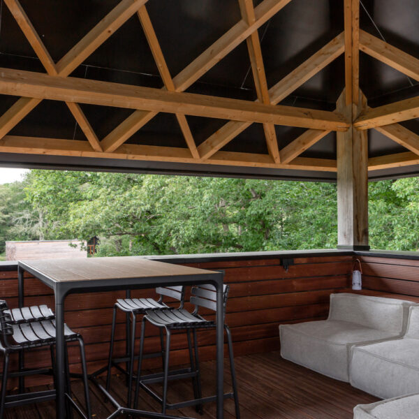 Das kleine Ferienhaus bietet Platz für vier Personen. Das Erdgeschoss besteht aus einem Raum mit der schnittigen Küche (mit Geschirrspüler), einer Essecke und einer mobilen Sitzecke. Alles ist so konzipiert und sorgfältig zusammengestellt, dass man die vorhandenen Möbel auch draußen aufstellen kann. An schönen Tagen kann man von drinnen nach draußen gehen, um den Wald und die Natur in vollen Zügen zu genießen. Im ersten Stock befindet sich das Schlafzimmer mit einem Doppelbett und einem eingebauten Etagenbett. Das kleine Badezimmer besteht aus einer Dusche und einer Toilette. Es gibt ein separates Waschbecken. Versteckt unter dem Dach des Heuschobers im Obergeschoss befindet sich die Dachterrasse mit einem Esstisch und einer Sitzecke. Ein schöner Ort, um zusammen zu sein, sich zurückzuziehen, die Natur zu erleben, einen Drink zu nehmen…