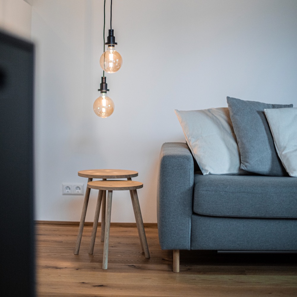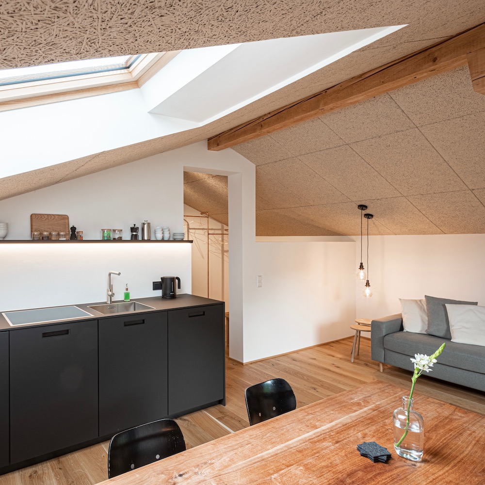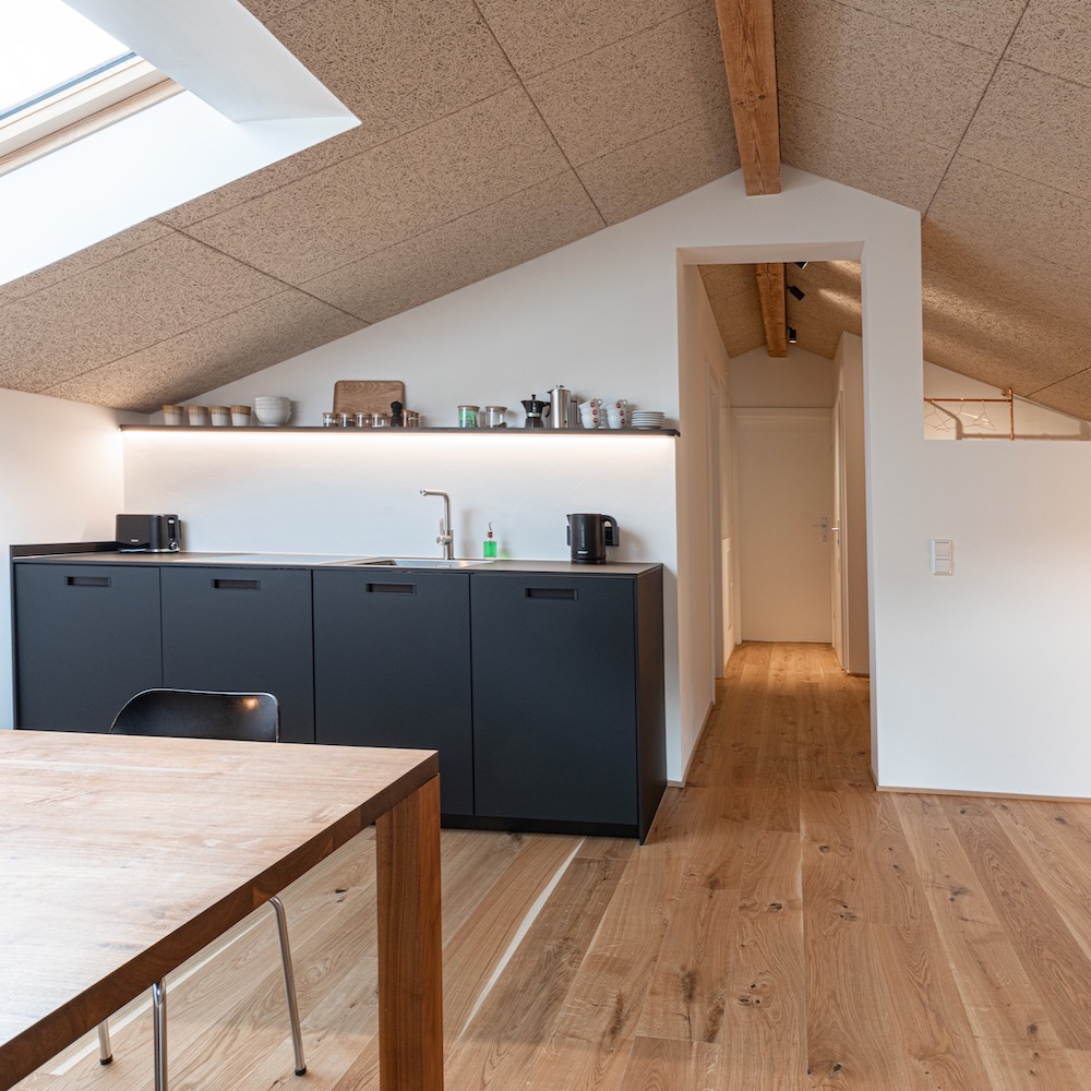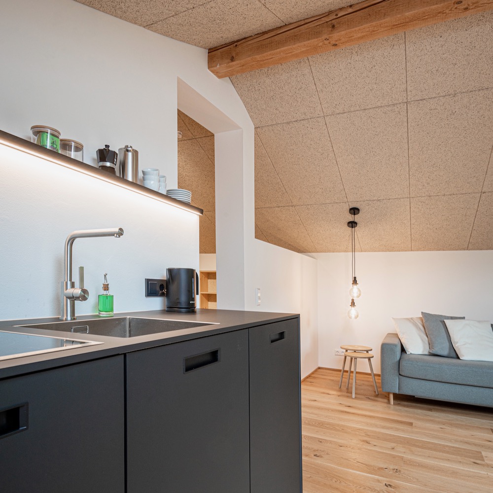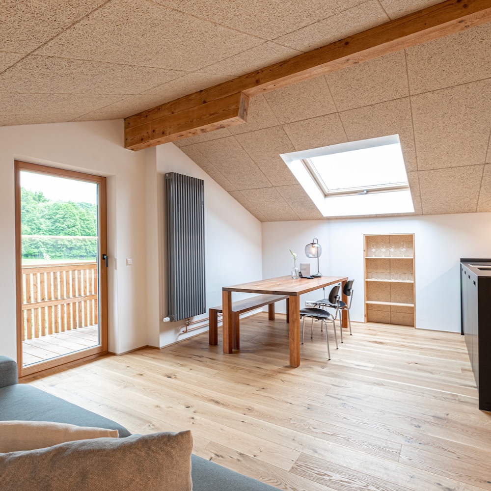 - Sternwarte: Für alle, die eine offene, loftartige Atmosphäre mit viel Glas und beeindruckender Aussicht lieben. Die großen Fenster der Zwei-Zimmer-Wohnung lassen die Natur sozusagen herein und verwöhnen dich bei Sonnenauf- und -untergang mit den schönsten Himmelsbildern.