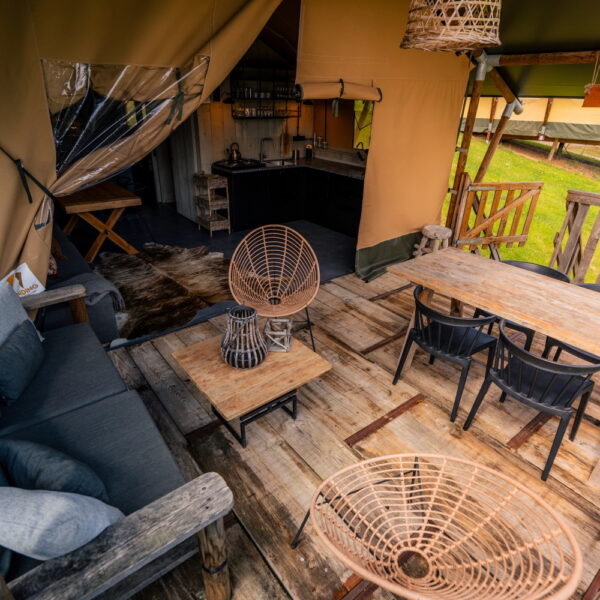 Wie luxuriös ist Glamping also wirklich? Das ist von Unterkunft zu Unterkunft unterschiedlich. Oft schläfst du in einem Safari- oder Lodge-Zelt, das nicht direkt auf dem Boden steht, sondern auf einem Holzunterbau. Im Inneren findest du nicht nur bequeme Betten, sondern in manchen Fällen auch eine voll ausgestattete Küche, einen Esstisch, eine Sitzecke, eine Toilette, eine Dusche oder sogar eine dieser klassischen Badewannen auf Beinen. Draußen gibt es in der Regel eine Terrasse mit Gartenmöbeln, Liegestühlen und in vielen Fällen auch einen Grill. Alle Annehmlichkeiten und Bequemlichkeiten eines Ferienhauses, aber unter einer Plane.