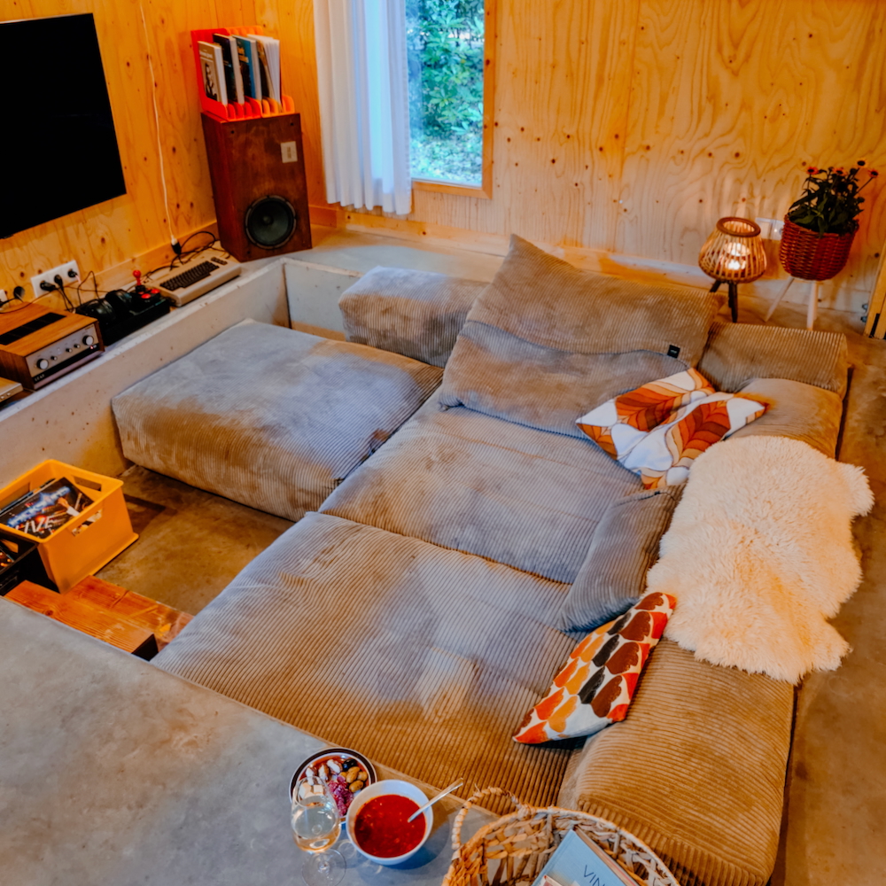 Das große Wohnzimmer hat gleich mehrere Blickfänge. Zuerst die Sitzecke – altmodisch gemütlich, perfekt zum Lümmeln oder Liegen auf dem Sofa. Dann zieht die Küche deinen Blick auf sich: orangefarbene Vintage‑Wandfliesen und Schrankgriffe, die aus Skateboard‑Rädern gefertigt wurden. Der Esstisch steht vor einem großen Fenster mit Blick auf die Terrasse. Vintage‑ und Retro‑Accessoires schaffen eine behagliche Atmosphäre, und die nostalgische Spielkonsole, der LP‑Player und der Flipper sorgen für stundenlangen Spiel‑ und Hörspaß. Und dann ist da noch die Schaukel im Wohnzimmer – ein Highlight für Kinder und für alle, die im Herzen jung geblieben sind. Lust auf noch mehr Überraschungen? Frag nach der ’t Hut Box.