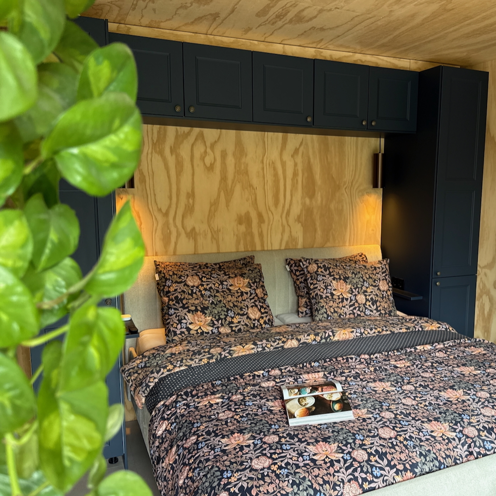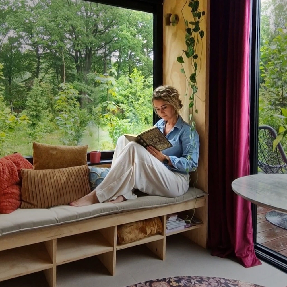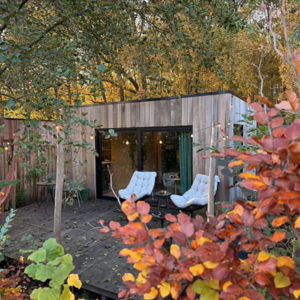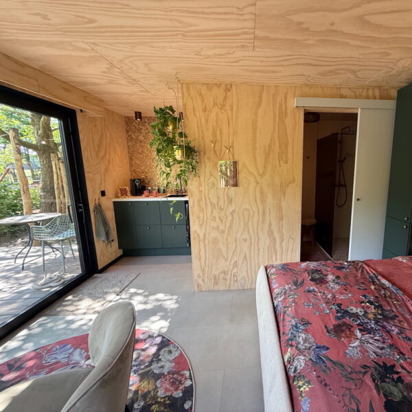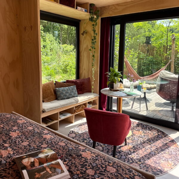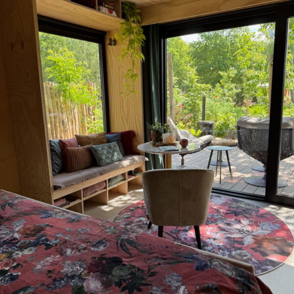 Cottage Night Blue hat tiefe Blautöne im Inneren, inspiriert vom Sternenhimmel über dir. Forest Green liegt unter der großen Erle und ist mit sanften Grüntönen dekoriert. Abgesehen von den Farben haben die Cottages viele Gemeinsamkeiten: ein palastartiges Doppelbett mit schönen Kissen, eine Sitzecke in einer Nische vor dem Fenster, in der du lesen kannst, hinter einer Schiebetür dein eigenes Badezimmer mit Regendusche und eine Ehrlichkeitsbar und Kaffeeecke mit Kühlschrank, Kaffee- und Teezubehör. Dank des Projektors und der Leinwand verwandelst du die Hütte nachts in ein Kino. Draußen erwartet dich eine geräumige Terrasse mit Hängematte und luxuriösem Lounge-Set. Dein Frühstückskorb – gefüllt mit frischen Croissants, lokalem Joghurt, Müsli und frisch gepresstem Saft – wird dir morgens an die Tür geliefert. Reserviere ihn unbedingt, es ist so schön, den Tag in Ruhe und mit dieser Art von Verwöhnung zu beginnen. Denke an die Hühner und Enten, die im Garten scharren, ein Eichhörnchen oder einen Rüsselspecht in den Bäumen und das Rascheln des Windes durch die Blätter. Hörst du die Eule? Willst du dich besonders verwöhnen lassen? Dann buche den privaten Wellness-Garten mit Whirlpool, Fass-Sauna und Gewächshaus. Was für ein Ort!