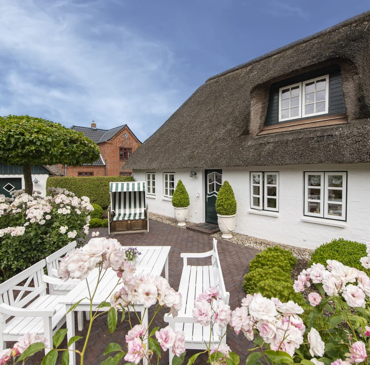 Das Reethaus 1799 versprüht mit seinem wunderschönen Reetdach, dem romantischen Garten voller Hortensien und weißer Rosen sowie den gemütlichen Ecken zum Entspannen den typischen friesischen Charme. Im Inneren wirst du von warmen Farben, Holzböden und einer stilvollen und gemütlichen Einrichtung empfangen, die einen Hauch von Nautik versprüht. Die niedrigen Decken, typisch für ein historisches Haus, sorgen sofort für ein Gefühl von Gemütlichkeit und Zuhause. Das ist Romantik pur: Aufwachen im Himmelbett, frühstücken am hölzernen Küchentisch mit Blick in den Garten und abends gemeinsam am Kamin bei einem guten Glas Wein. Im Sommer ist der große, sonnige Garten der Lieblingsplatz. Hier kann man auf der Terrasse ein geschütztes Plätzchen genießen, auf den Liegestühlen relaxen oder sich mit einem Buch in einen Strandkorb kuscheln. Von April bis November stehen die Gartenmöbel bereit. Der Duft blühender Rosen rundet die Atmosphäre ab.