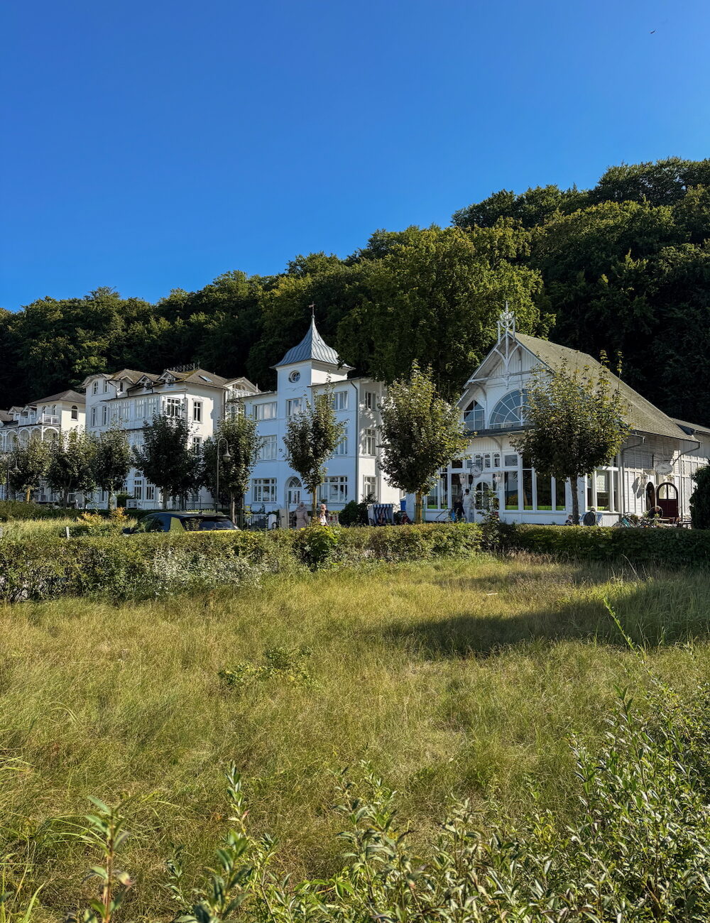 Der Norden Rügens ist zerklüftet und beeindruckend. Wir starten in Sassnitz, einer Hafenstadt, die sich perfekt für einen Zwischenstopp eignet. Tipp von Maria vom Restaurant ONDA: Geh zum Abendessen in die Osteria La Torre, ein kleines italienisches Restaurant im Hafen. Wenn du von Sassnitz aus losfährst, kommst du auf der Halbinsel Jasmund an. Der Nationalpark Jasmund ist vielleicht das ikonischste Stück Rügens und gleichzeitig der kleinste Nationalpark Deutschlands. Doch hier findest du einen der größten Schätze des Landes: die berühmten Kreidefelsen, die bis zu 118 Meter hoch aus der Ostsee aufragen. Der Königsstuhl ist der Blickfang, den man heutzutage vom schwimmenden Skywalk aus bewundern kann, der dir das Gefühl gibt, über dem Meer zu schweben. Aber Jasmund ist mehr als nur weiße Klippen: Der Park beherbergt ausgedehnte Buchenwälder, die so besonders sind, dass sie zum UNESCO-Welterbe gehören. Jahrhundertealte Stämme, dichtes Laub und gefiltertes Licht machen jeden Spaziergang hier magisch. Eine der schönsten Routen führt von Sassnitz nach Lohme, wo du auf schmalen Wegen entlang der Küste immer wieder neue Ausblicke auf die Kreidefelsen und das klare blaue Meer genießen kannst.