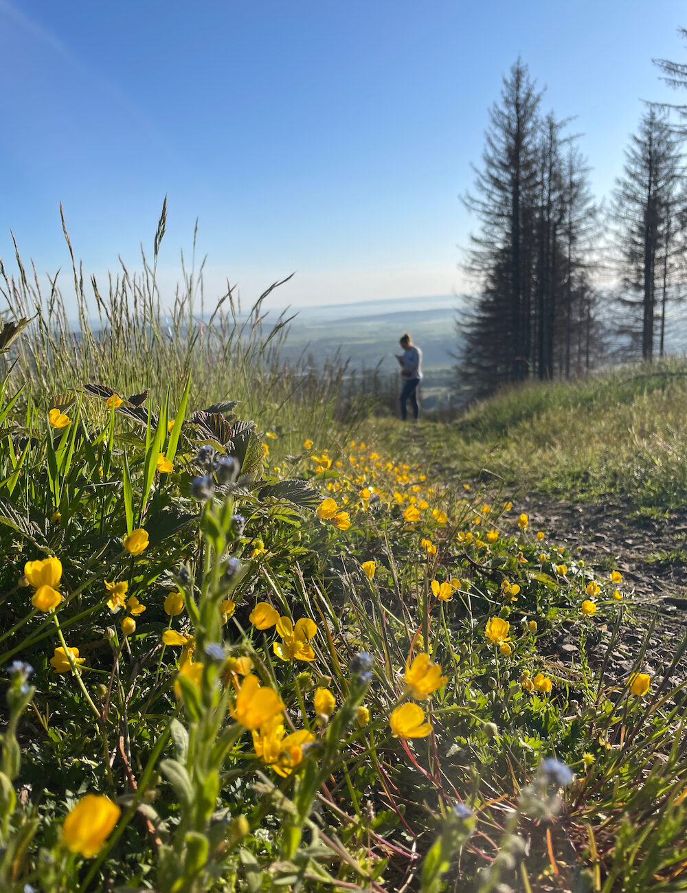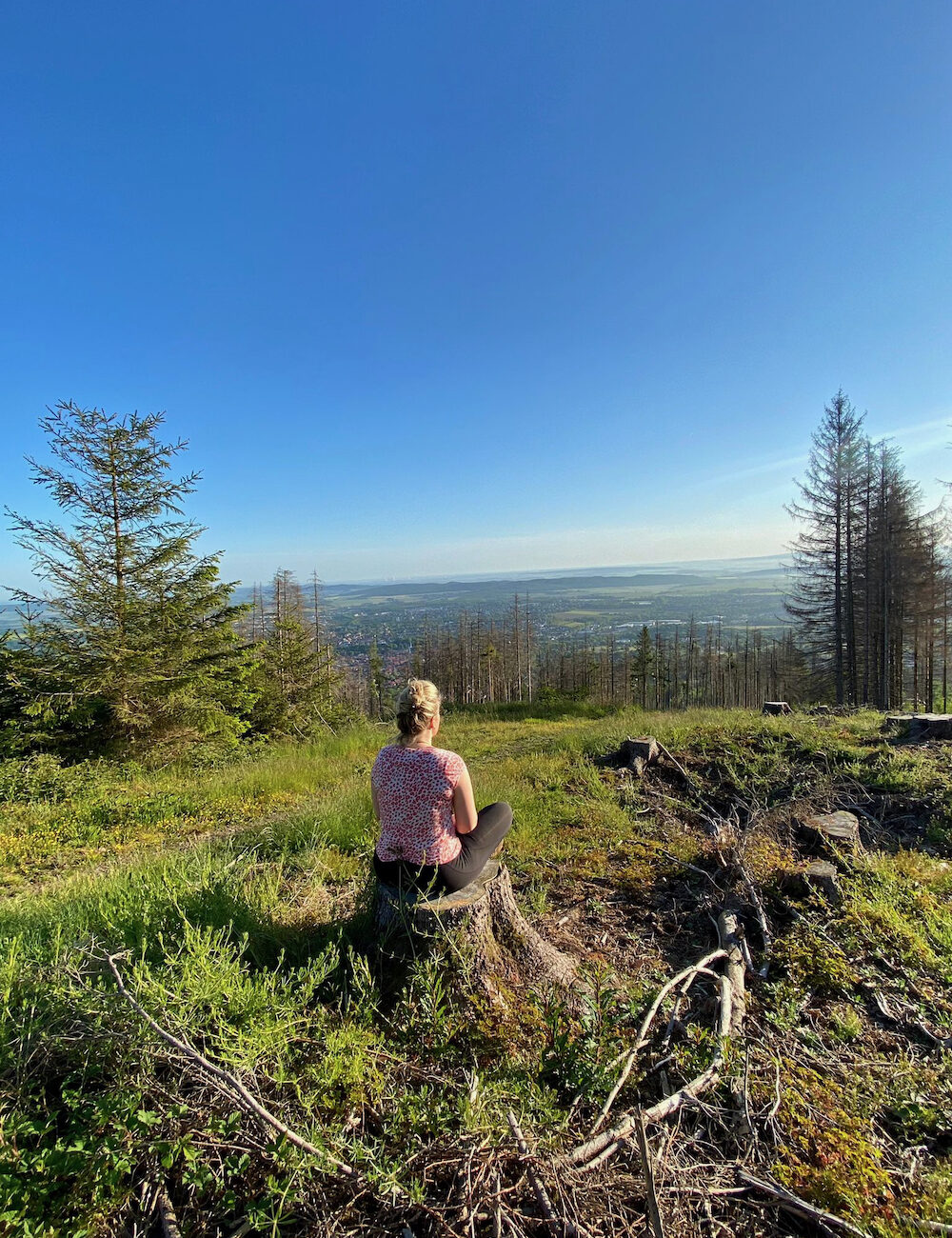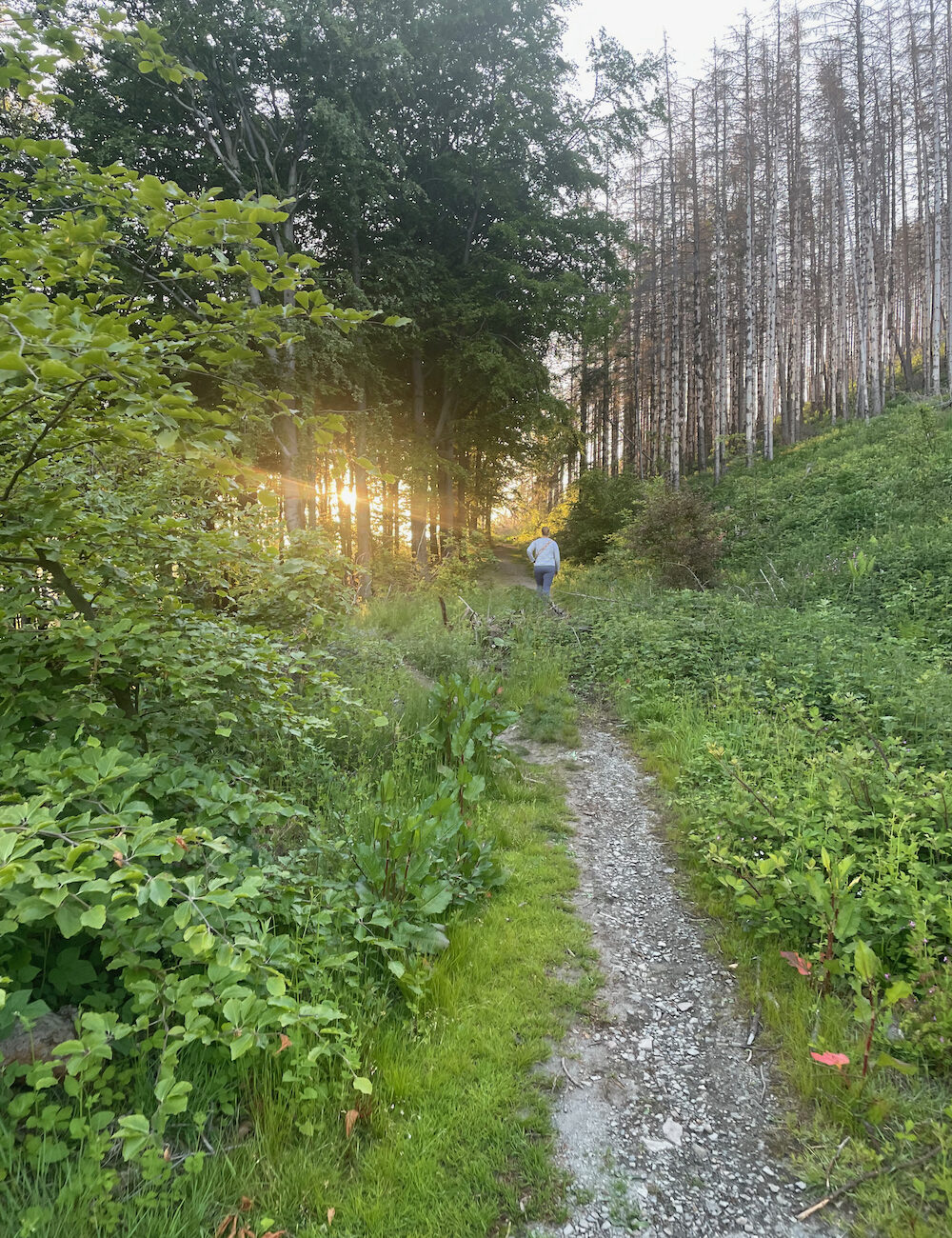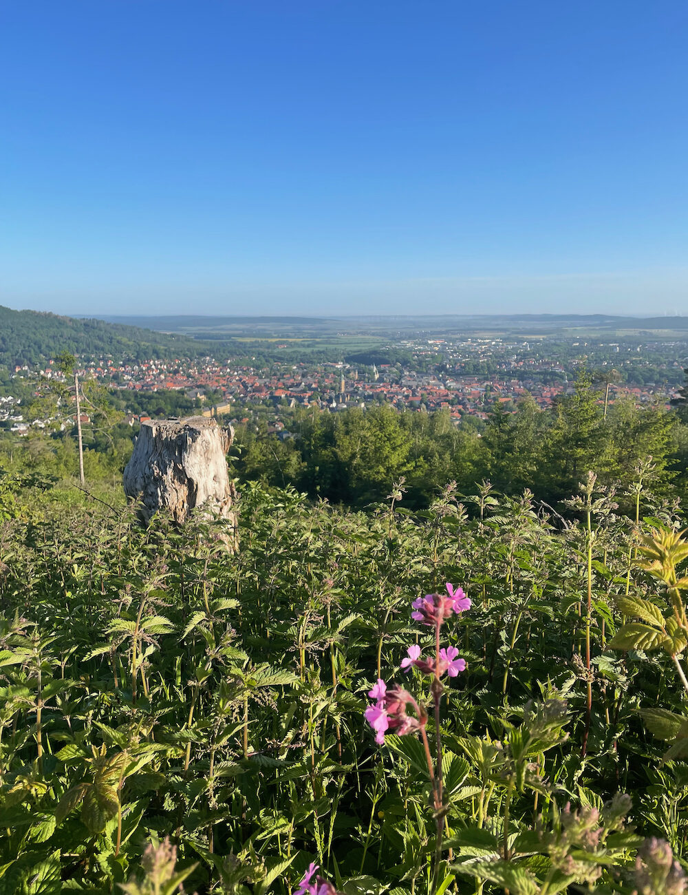 Goslar liegt am Fuße des Rammelsbergs, und als wir gestern ankamen, zog uns der Berg wie ein Magnet an. Und du weißt ja: „Wenn die Berge rufen, musst du gehen”. Deshalb parken wir an diesem frühen Morgen unser Auto beim Restaurant Maltermeister Turm. Man kann sich gut vorstellen, dass hier an schönen Tagen viele Leute die deutsche Küche und die atemberaubende Aussicht genießen. Wäre das Restaurant schon geöffnet, wäre es verlockend, sich hier gleich niederzulassen. Aber wir biegen rechts in den schmalen Waldweg ein, der langsam aber sicher ansteigt. Auf halber Höhe verstehen wir, warum die Rezeptionistin im Saxer Hotel uns so herzlich „viel Glück“ gewünscht hat. Denn was von unten so freundlich sanft abfällt, entpuppt sich als ziemlich steiler Aufstieg. Aber hey, so haben wir die Gelegenheit, regelmäßig anzuhalten und voller Bewunderung zu beobachten, wie die Sonne den Tau über den weitläufigen Hügeln und Feldern rund um die Stadt langsam auflöst und die roten Dächer der Altstadt zum Strahlen bringt.