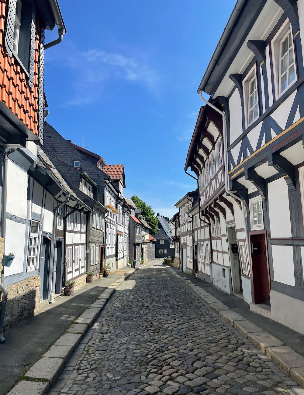 Es ist gerade halb sechs und wir schlendern zusammen durch die engen Gassen. Das frühe Morgenlicht taucht die schönen Fachwerkhäuser in ein wunderschönes Licht. Beim Bäcker herrscht reges Treiben, aber ansonsten ist die Stadt Goslar im deutschen Bundesland Niedersachsen noch tief verschlafen.