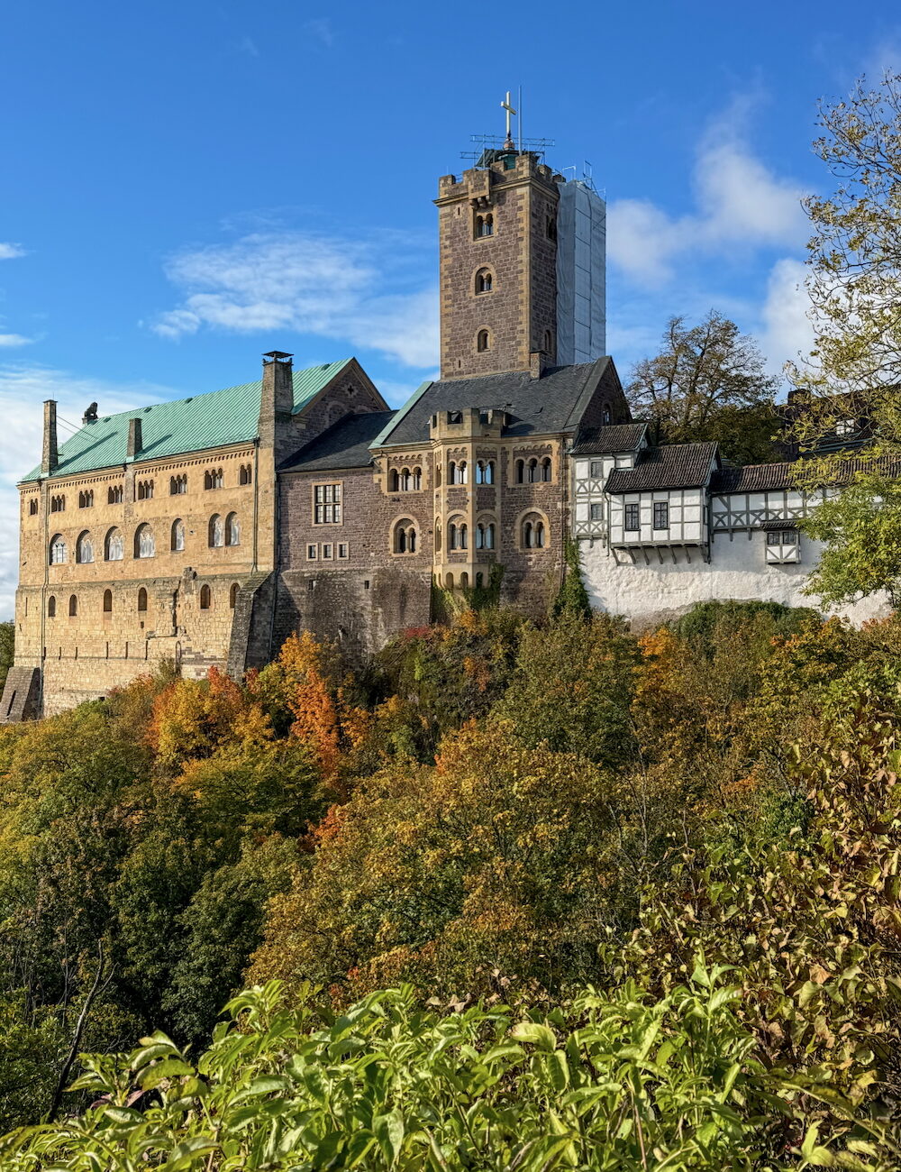 Es gibt eine Reihe von Gründen, warum du einen Besuch in Eisenach nicht auslassen solltest. Der Hauptgrund ist die Burg, die hoch über Eisenach thront: die Wartburg, die seit 1999 zum UNESCO-Weltkulturerbe gehört. Hier übersetzte Luther das Neue Testament. Von der Stadt aus geht es im Zickzack bergauf. Zu Fuß über Waldwege oder mit dem Bus von einem Parkplatz vor den Toren Eisenachs bis zum Fuße der Burg und vielleicht das letzte Stück mit dem Shuttle bis zum Tor. Oben angekommen, erwartet dich eine atemberaubende Aussicht auf den Thüringer Wald. Das allein ist schon den Aufstieg wert. Buche die geführte Tour im Voraus. So erlebst du die Wartburg nicht nur als Bild auf einem Hügel, sondern als lebendige Kulisse: Räume voller Geschichten.