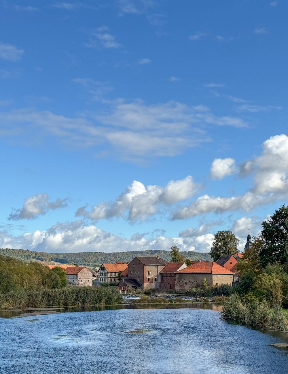 Der Fluss Werra schlängelt sich durch Thüringen. Rund um die alte Handelsstadt Creuzburg wirkt die Werra besonders idyllisch. Spaziere über die historische Werrabrücke, steige zur Burg Creuzburg hinauf und blicke über das Tal. Ein paar Kilometer südlich von Creuzburg liegt das Stiftsgut Wilhelmsglücksbrunn: ein historischer Gutshof mit einem Bio-Bauernhof, einem Café (Bistro) und einem Hofladen, in dem man einheimische und regionale Produkte kaufen kann. Ideal für einen leckeren Zwischenstopp oder als Mittagsadresse. Hier schmeckst du buchstäblich die Region. Wenn du der Werra in Richtung Norden folgst, kommst du an Wanfried vorbei, einem schönen Ort mit Fachwerkhäusern und einem „kleinen Hafen“ mit einer großen Terrasse am Fluss. Sehr idyllisch (wie auch das Dorf Sallmanshausen)!