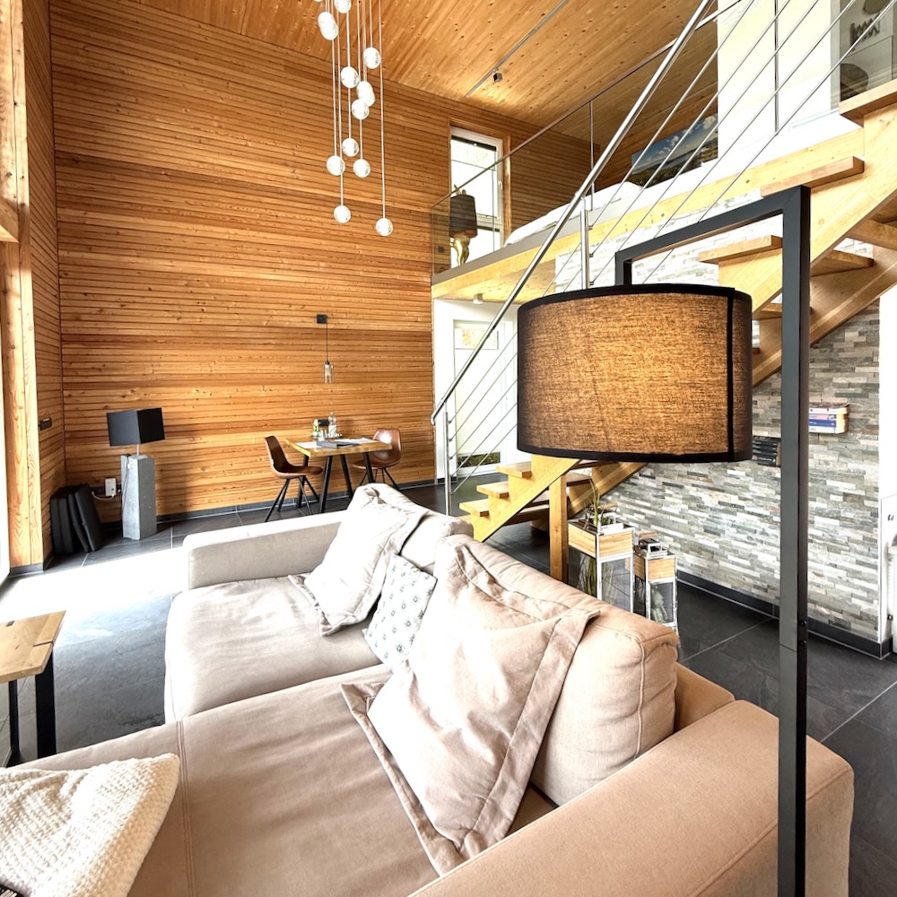 Die Design-Chalets Platzhirsch und Freiwild befinden sich in Rieden. Sie sind moderne Designwürfel aus Holz, die sich an den Hang über den Ort Rieden schmiegen. Sie sind bewusst nur für Erwachsene gedacht und legen Wert auf Ruhe und Privatsphäre. Beide Häuser sind ideal für 1-2 Personen, die Komfort und Natur zu schätzen wissen. Im Inneren findest du einen offenen Wohnbereich mit Küche, Ess- und Sitzecke; im Obergeschoss schläfst du auf einer Galerie. Beide Chalets überraschen mit moderner Architektur und einer großzügigen Panoramafassade. Draußen erwartet dich der Südbalkon mit einem Essbereich, Liegestühlen, einem Grill und einem weiten Eifelblick: ruhig und grün. Ideal für Paare, die Ruhe und Natur suchen, denn Restaurants und der See sind zu Fuß erreichbar.
