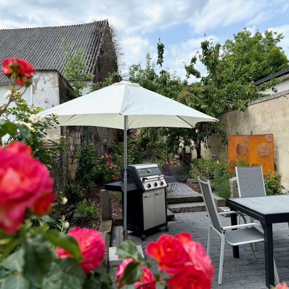 Das Rosengärtchen (ca. 80 m², bis zu 2 Personen) ist ein liebevoll restauriertes Fachwerkhaus aus dem Jahr 1807. Die authentischen Materialien Holz, Lehm und Basalt schaffen eine warme Atmosphäre. Das Ferienhaus verfügt über zwei gemütliche Schlafzimmer, eine voll ausgestattete Wohnküche (mit Blick auf die Terrasse), ein gemütliches Wohnzimmer mit Leseecke und ein Badezimmer mit begehbarer Dusche. Draußen erwartet dich ein romantischer Rosengarten mit Terrasse und Gasgrill. Hinweis: Die steile Holztreppe macht einen Teil des Charmes aus, ist aber für kleine Kinder oder Menschen mit Mobilitätsproblemen weniger geeignet.