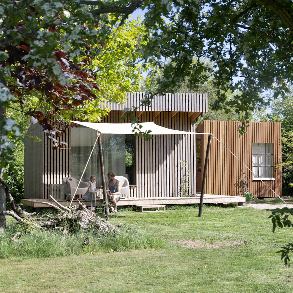 Die hölzerne, gut isolierte Hütte ist eigentlich wie ein Hotelzimmer, aber es gibt nur ein einziges und das liegt mitten im Gras. Die Einrichtung ist auffallend: mit frischen, sonnigen Farben, Holz und schönen Details. Schön hell, auch dank des großen Fensters vor dem Doppelbett. Eine gemütliche Sitzecke, eine Küchenzeile und eine eigene Dusche und Toilette (1 Stufe nach draußen) gehören ebenfalls dazu. Schlafen im Grünen, mit Blick ins Grüne.