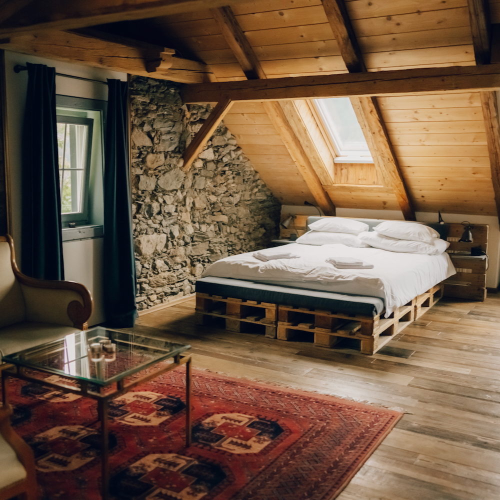 Das Waldhaus Rudolfshöhe verfügt über nur vier Zimmer, jedes mit einer eigenen warmen Atmosphäre. Innen spürt man den historischen Charakter des Hauses, interpretiert in einer frischen, zeitgemäßen Gestaltung, in der Holz, Stein und sorgfältig ausgewählte Farben den Ton angeben. Einige Zimmer bieten eine Sitzecke oder einen Holzofen, andere überraschen mit einem gläsernen Badezimmer, in dem du unter der Dusche die Sterne beobachten kannst, oder mit einem zusätzlichen Rückzugsort. Das Frühstück ist reichhaltig, bewusst zubereitet und wird frisch, pur und ohne Eile serviert. Danach geht es hinaus in die Berge oder ins Dorf – oder du lehnst dich zurück, trinkst einen Kaffee und genießt den Blick über das Gasteinertal.