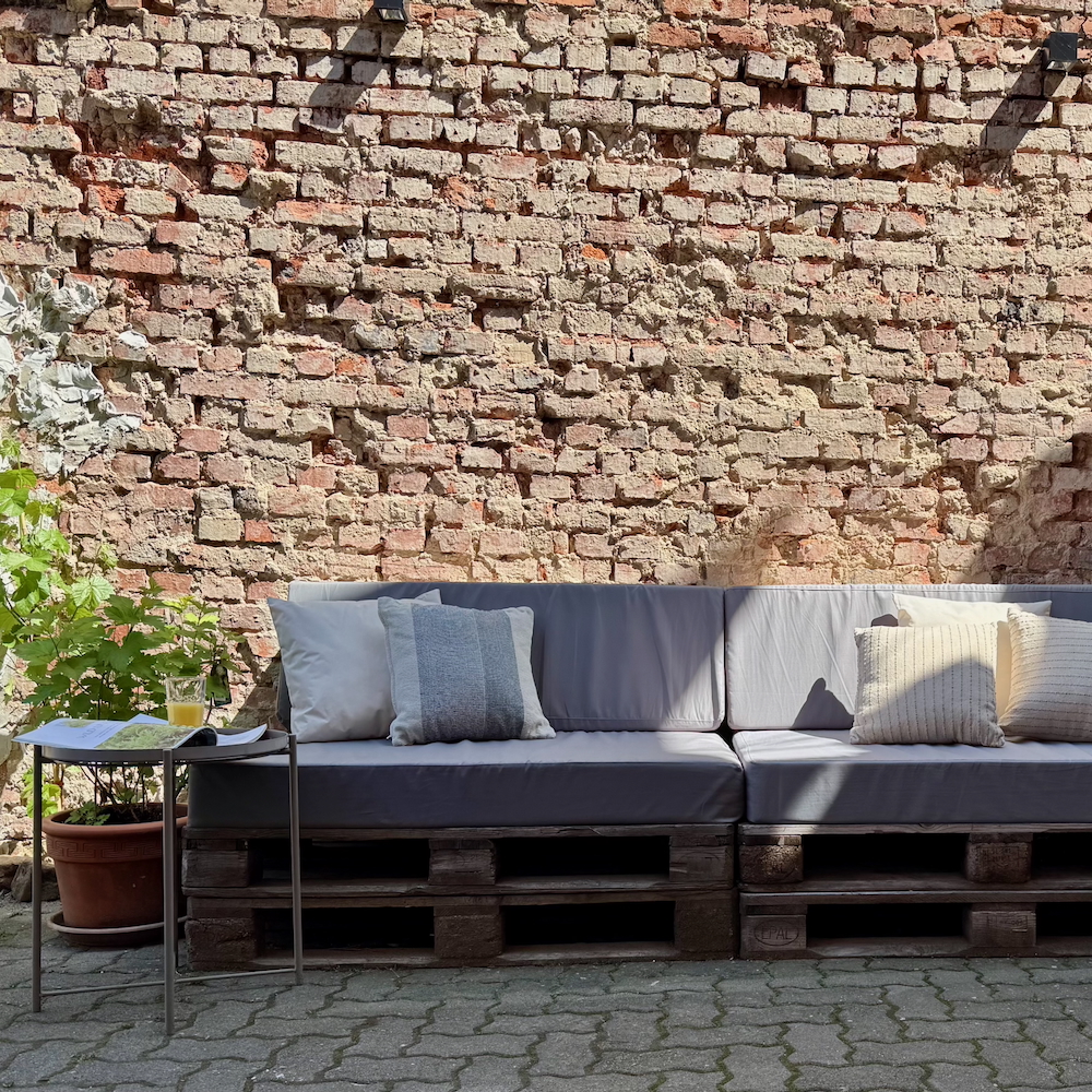Der Innenhof ist vielleicht der überraschendste und zugleich schönste Teil des Hauses. Mit einer gemütlichen Sitzecke, einem großen Esstisch, Grill und Feuerstelle ist er wie gemacht für laue Sommerabende. Dazu ein kühler Grauer Burgunder aus der Pfalz – und der Abend ist perfekt.