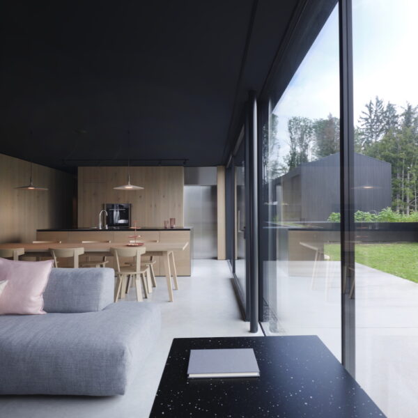 Auch wenn das Hotel von außen anders aussieht, nämlich echt österreichisch, erwartet dich beim Anblick der Lodge und des Wellnessbereichs eine große Überraschung. Klar gestaltete schwarze Holzkuben mit großen verspiegelten Fenstern liegen zwischen den Bäumen an die Bergwand geschmiegt. Das Design ist inspirierend und innovativ zugleich. Egal, ob du den Wellnessbereich oder die Lodge betrittst, du wirst garantiert staunen!